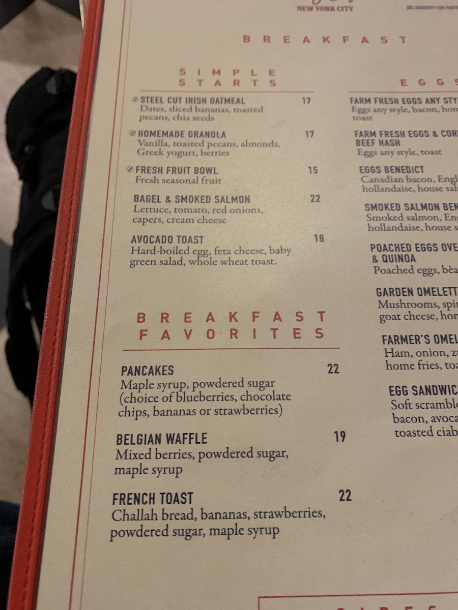 Health-conscious diners will appreciate the green options as well, with delightful additions like Steel Cut Irish Oatmeal and Homemade Granola – each priced at $18. And for those who crave savory bites, the Bagel & Smoked Salmon at $24 and Avocado Toast at $18 are must-tries that’ll leave your taste buds dancing.